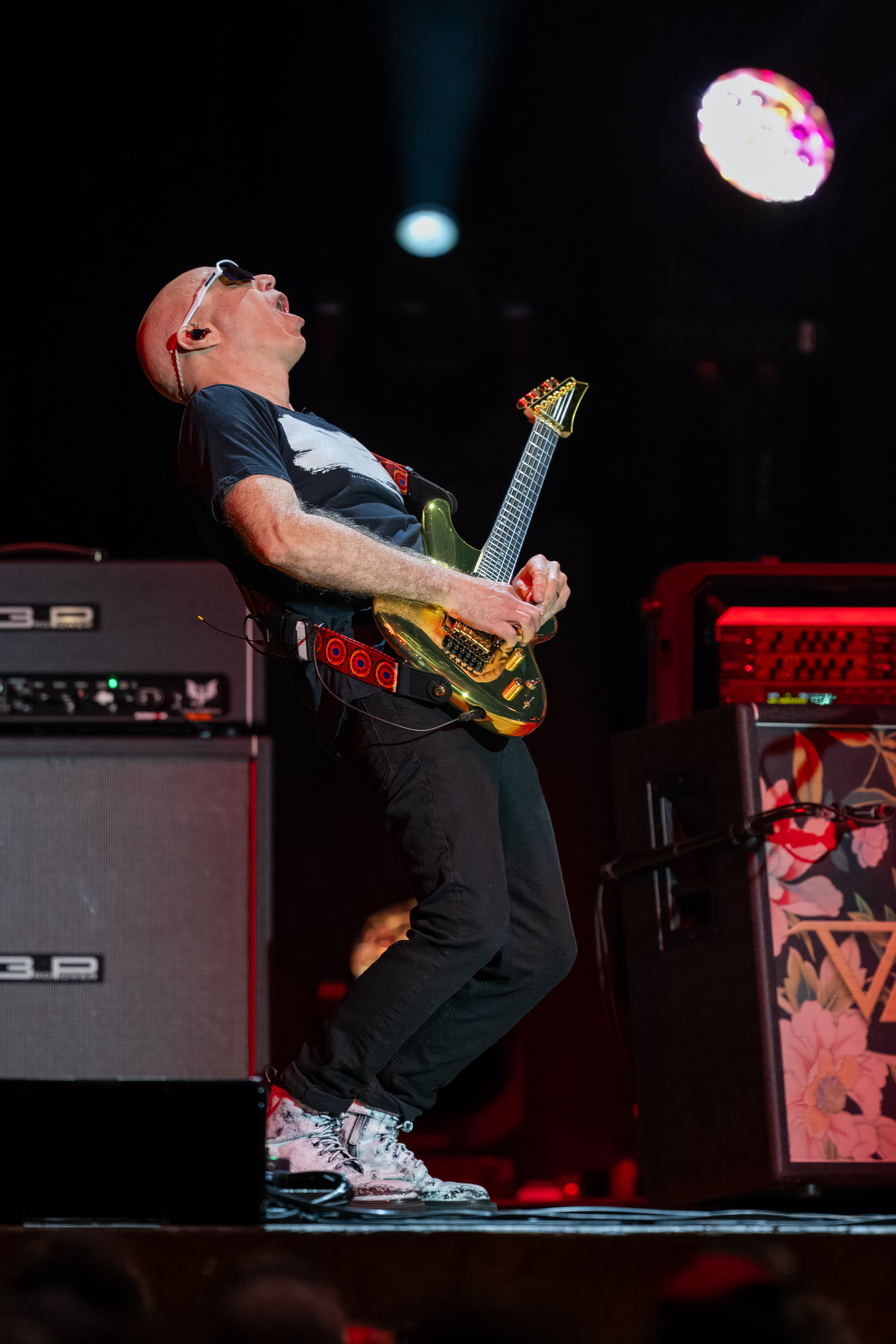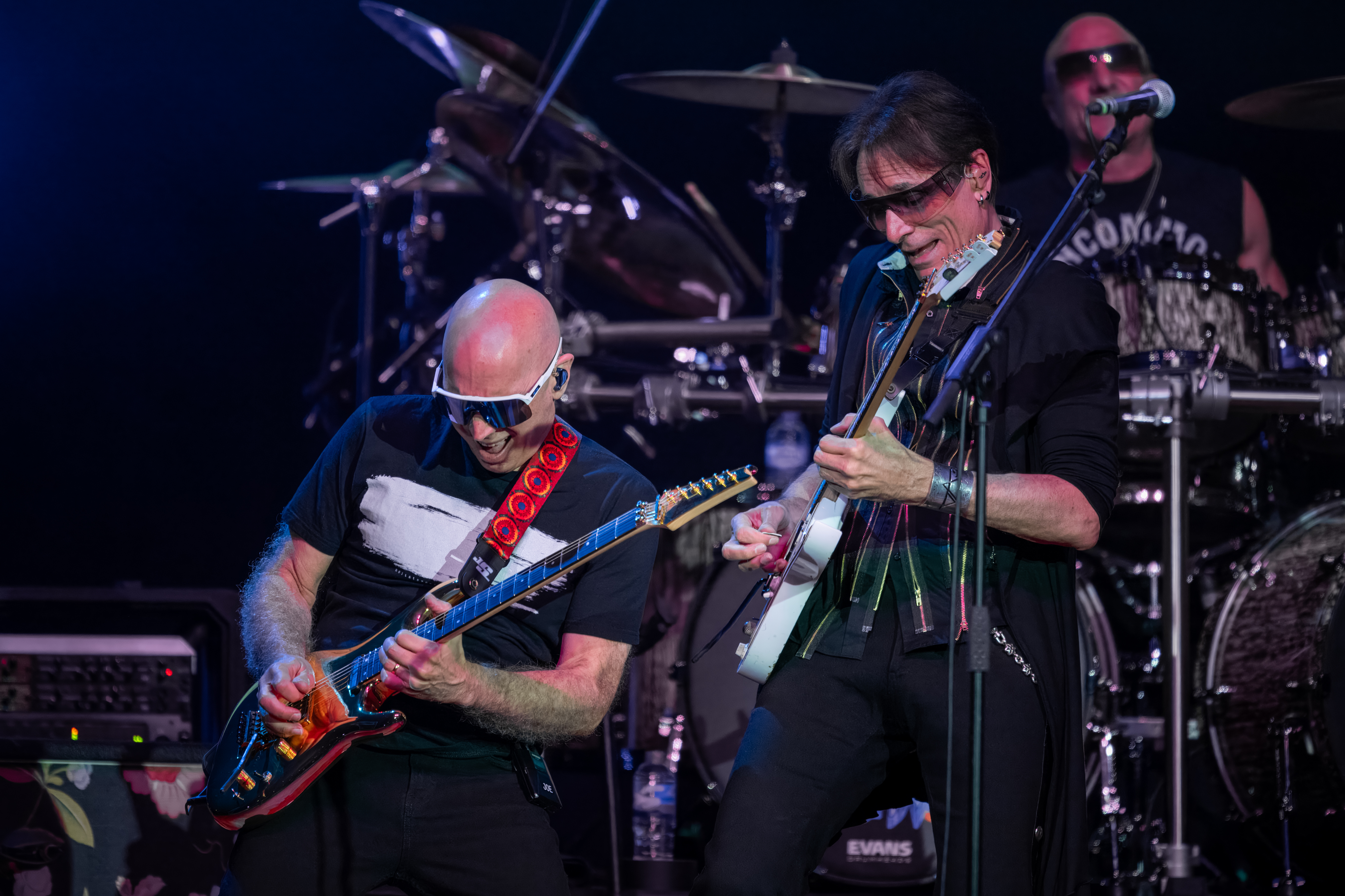 Vai, tall and lean, follows with an urgent Zeus In Chains and Little Pretty, the latter a song that fails to live up to its title and which proves fairly forgettable. Then Satriani returns and the two trade licks in a mash-up of Joe’s Ice 9 and Steve’s The Crying Machine.
